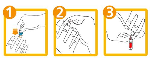 The self-test is a finger prick test. It requires you to extract at least 400 microliters of blood (about 10 drops of blood) from your finger using a lancet. A lancet is a sharp object which will make a small puncture or prick in your finger so you can draw blood out.
